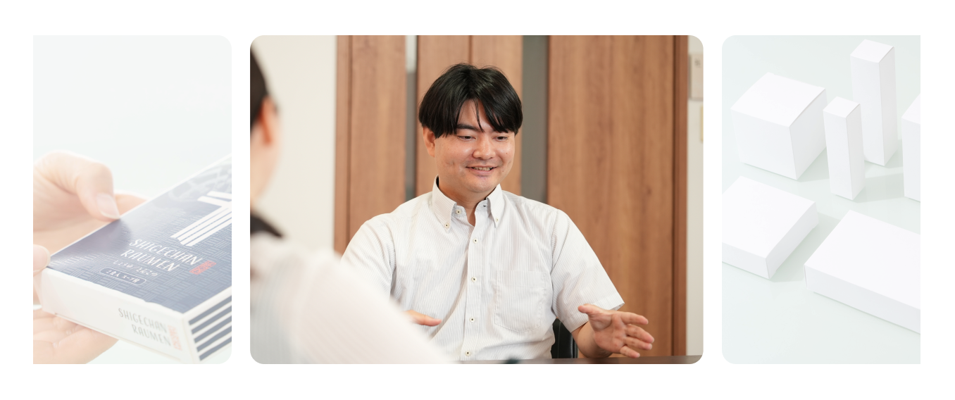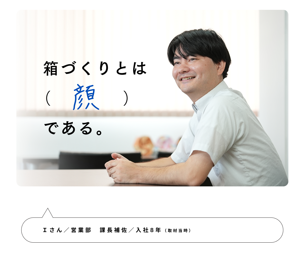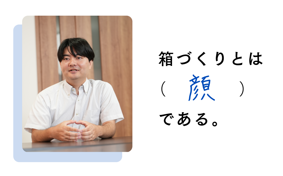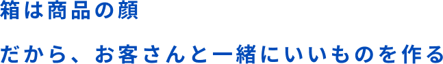 箱は箱じゃないですか(笑)。でも、箱づくりは( 顔 )ですね。消費者にとっては箱は見た目だし、どんなに中の商品が良くても箱が汚かったら買われないと思うし。販売ビジネスとしても、メーカーさんはそれぞれデザインとかこだわりを持ってみえるから、そういうのに何とかうちの力を…協力ができればな、一緒にいいものを作れればなと思う。