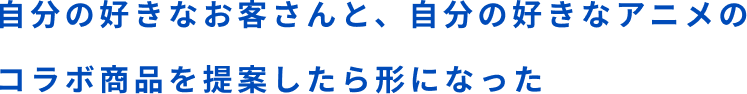 去年、新規のお取引きで。2年ぐらい通っていて、なかなか仕事を決められないなぁと思いながら…そんなとき、そのお客さんの商品がアニメの中に登場すると聞いて。そのコラボ商品を「こんなのどうですか?」と言ったものが形になった。