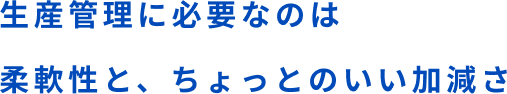 柔軟性がやっぱりいるかなと思いますよね。型にはまるものが受注生産である以上なくて、だからそこを飲み込めるというか。難しいことはやってないです。でも、予定入らないって言われちゃった・・もうダメだ・・ってなっちゃわないこと。生産管理にはあまり真面目すぎちゃうより、なるようにしかならないや!ってちょっといい加減な方がいいかもしれないですね(笑)あとは自分が頼まれる側だったときに、こうやって言われればちょっと無理してでも(やろうって思う)とか。コミュニケーション能力は必要ですね。