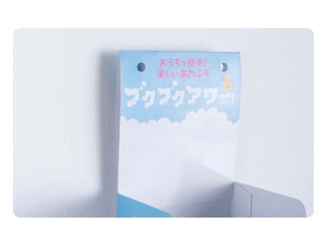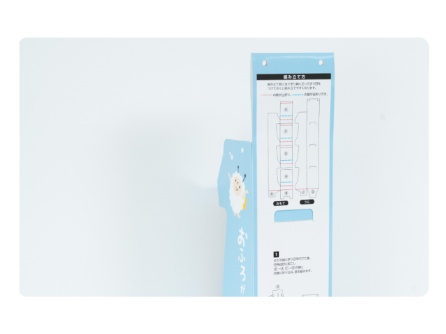 什器はパッケージよりも長い期間使用されることが多いので、耐久性アップのため、通常のパッケージよりも分厚い紙を使用しています。
