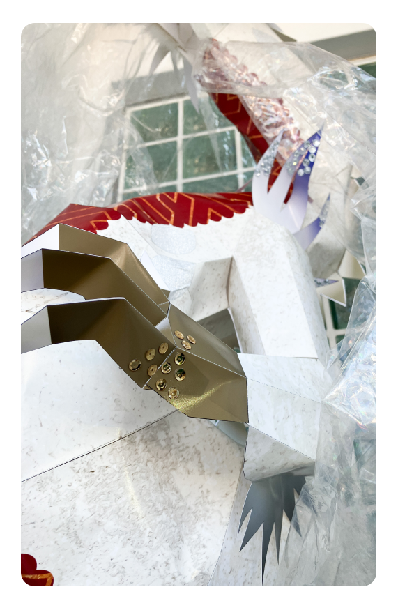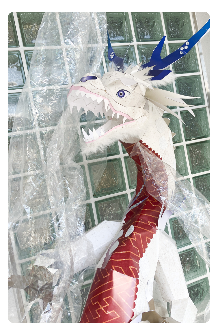 お盆休みに入る直前に、デザイン学校の先生にもご協力いただき設置を行ったのですが、猛暑で接着が剥がれてしまい、お盆明けに出社してみると龍が崩れ落ちているという悲しい事態に…。