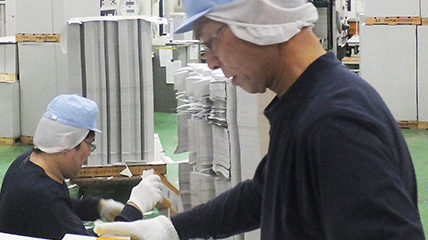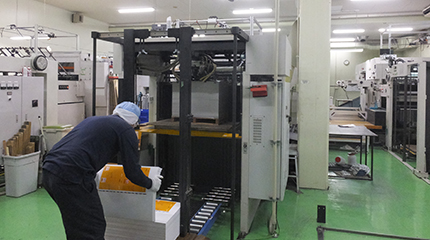 型抜きを終えた製品は手作業によって次工程に。スピーディーに品質優先で作業します。